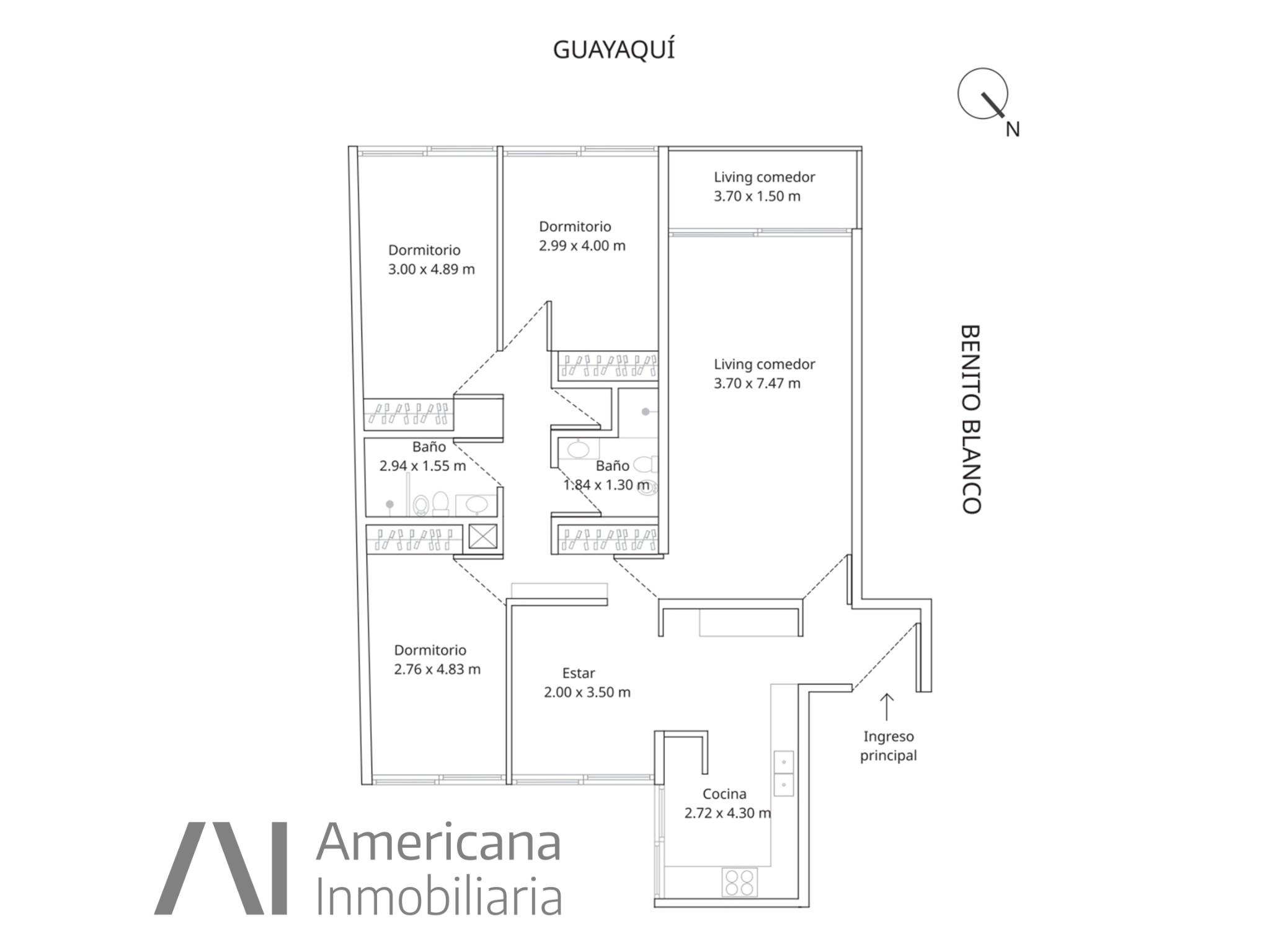 Americana Inmobiliaria vende. Propiedad ubicada en la esquina de Juan Benito Blanco y Guayaquí. A una sola cuadra de Rambla República del Perú. Zona que ofrece gran variedad de servicios, accesibilidad y lugares de esparcimiento. Apartamento dispuesto en un sexto piso, con funcional distribución, desarrollado en 120 m² habitables + 7 m² de terraza, sobre calle Guayaquí. Frente orientado al suroeste. El mismo cuenta con: ingreso principal a hall de recibimiento. Cómodo living con acceso a terraza principal, amplia cocina definida con gran capacidad de placares tanto en aéreo como en bajo mesada y comedor diario. Ésta cuenta además con campana de extracción, anafe y horno instalados. Tres dormitorios de generosas dimensiones, con placares empotrados con aprovechables espacios interiores. Dos baños completos actualizados. La planta dispone de doble circulación. Ofrece pisos de parquet en living, circulación y uno de los dormitorios. Los dos dormitorios restantes cuentan con pisos flotantes, debajo de los cuales se encuentra el parquet original en buen estado. A excepción del living, todos los ambientes cuentan con ventanas de aluminio actualizadas. Persianas en todas las aberturas. Aire acondicionado en un dormitorio. Edificio de sólida construcción, con excelente presencia. Ofrece portería física las 24 horas compuesta por cuatro turnos y circuito de cámaras, así como también calefacción central por losa, por bomba de calor. No dude en solicitar información, con gusto lo atenderemos.
